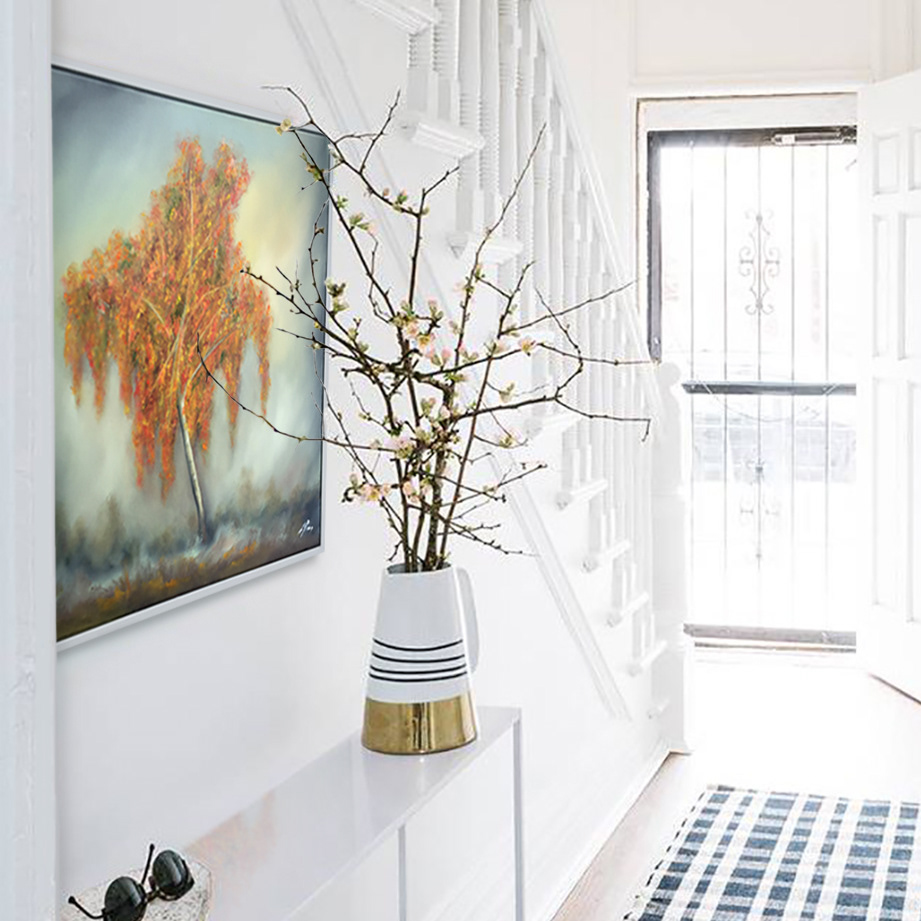 Peaceful, abstract tree painting. Light and atmospheric, featuring a richly coloured, solitary Autumnal birch tree against a yellow/grey sky suggestive of the approaching Winter.