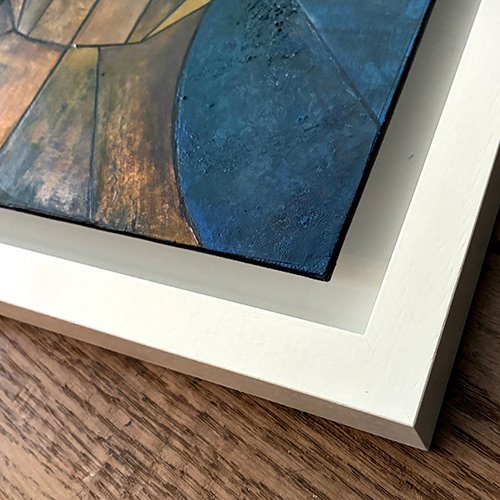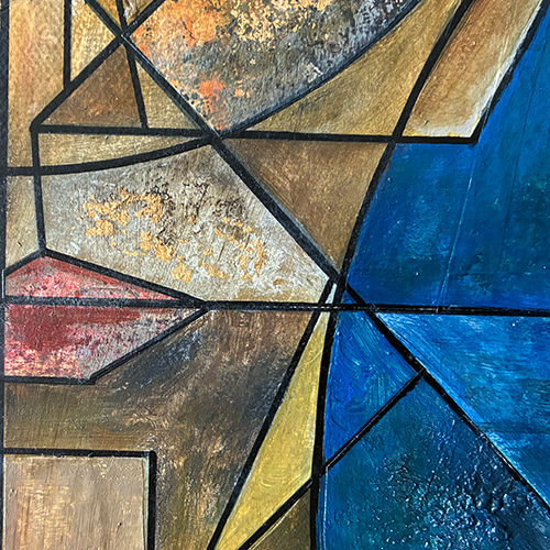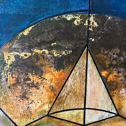 Geometric composition depicting the almost human nature of the bots that we are gradually coming to depend on for more and more of our daily tasks. Created with layers of scrap paper, old books and labels and overpainted with layers of acrylic along with touches of gold leaf.