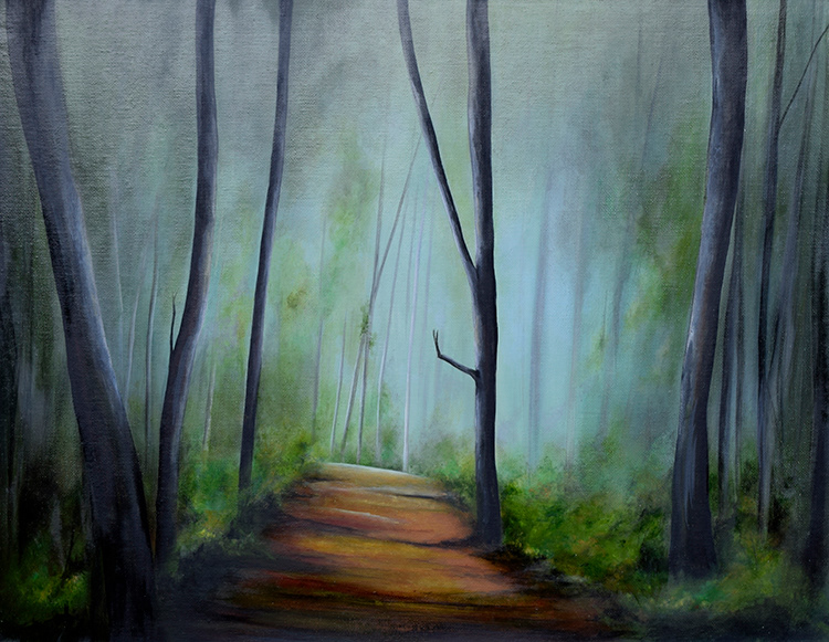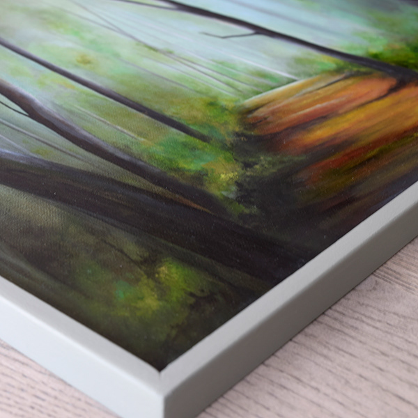 A walkway through a shaded forest. Framed in light grey and ready to hang. Artwork will be packed securely and protected with bubble wrap and heavy cardboard for postage