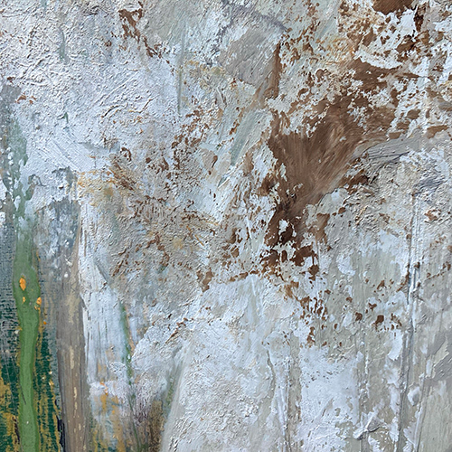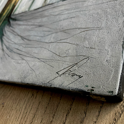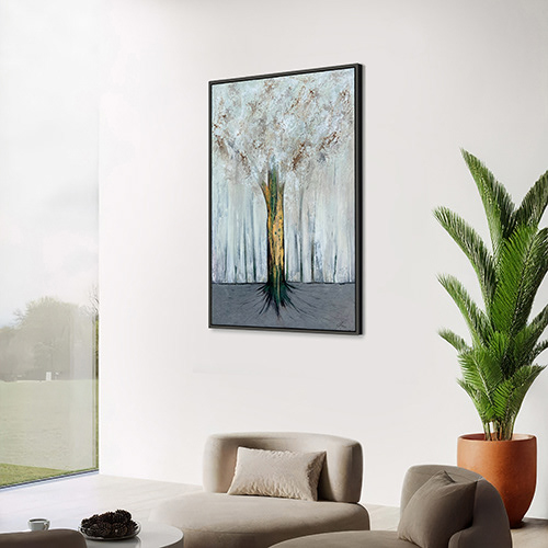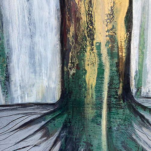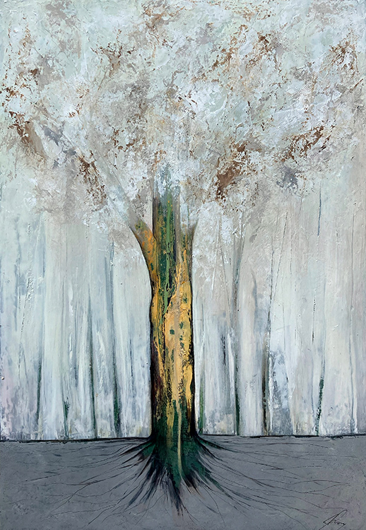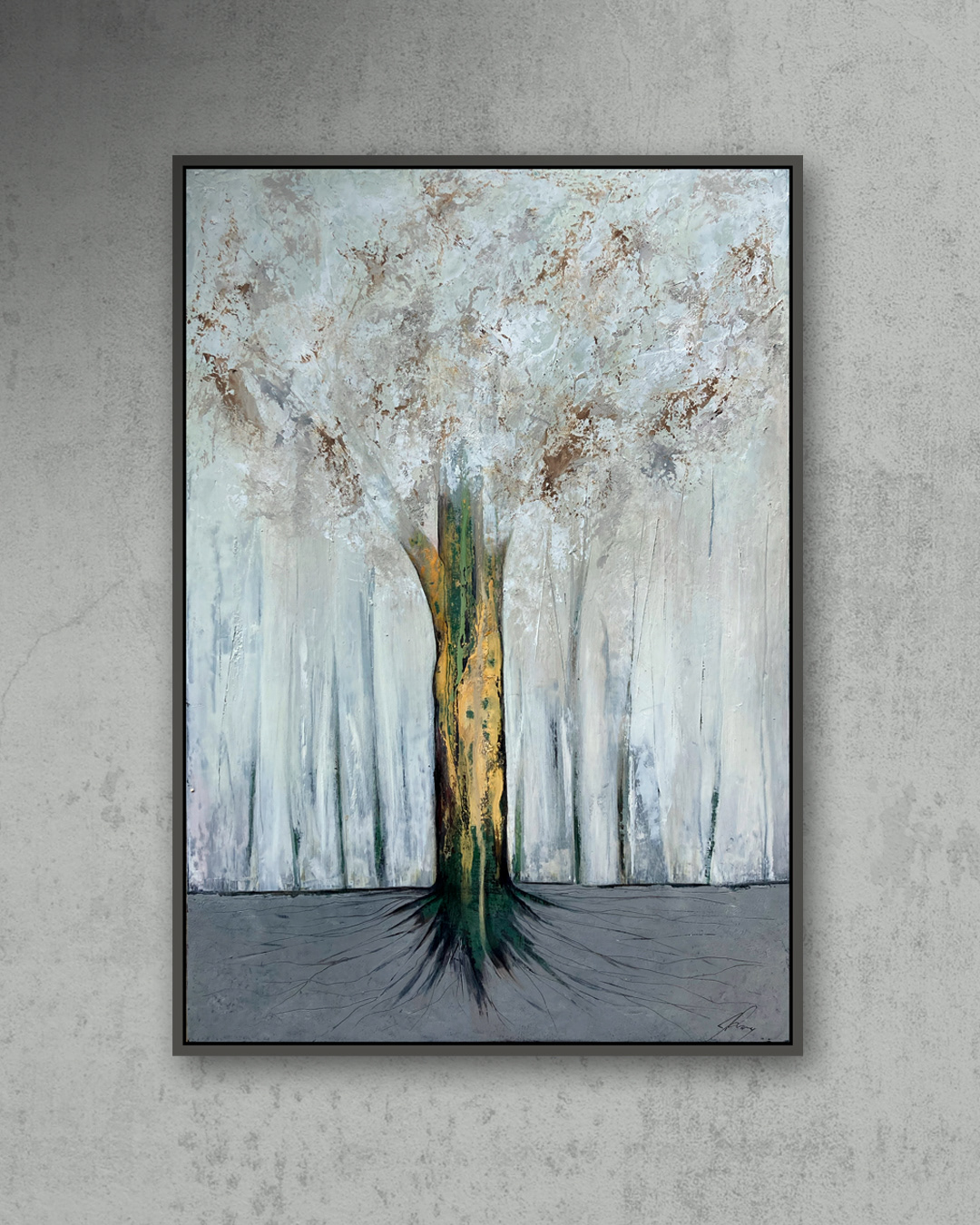 An atmospheric abstract painting depicting a majestic tree rising from the ground. Gradually layered up, with layers being partially removed and sctrached out as the painting developed. Unframed, board edges are painted black and the piece is ready to hang.