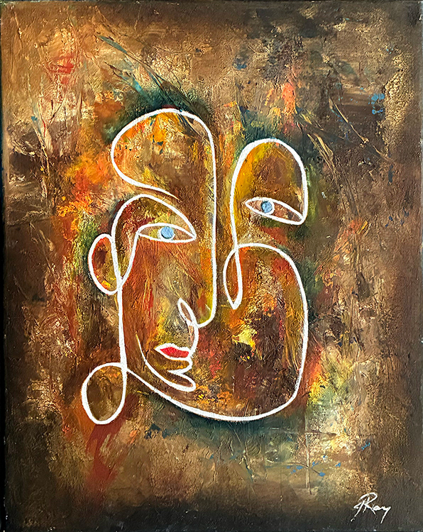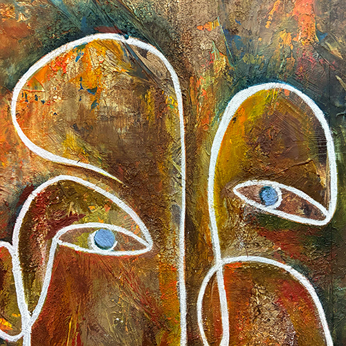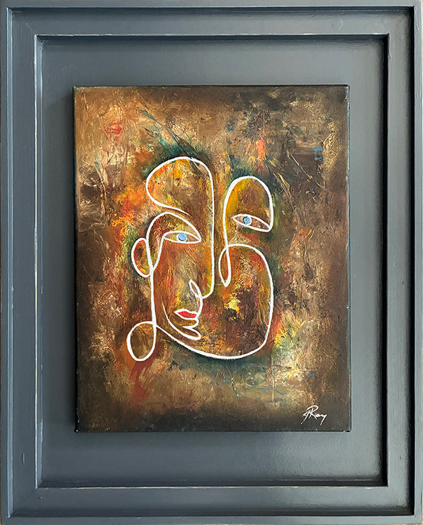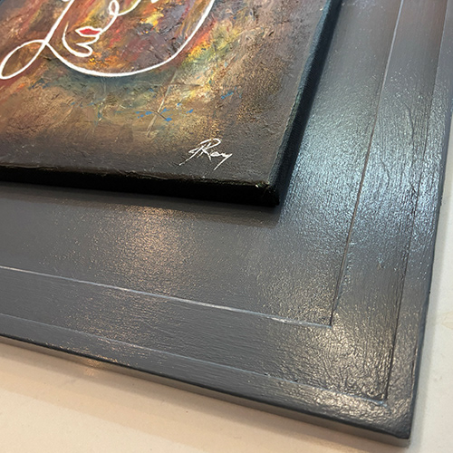 Energetic, textured piece, the use of pallet knife, rough brushes and sand create a feeling of texture and depth. An abstract face (or 2?) sits on top. Oversized charcoal grey frame.