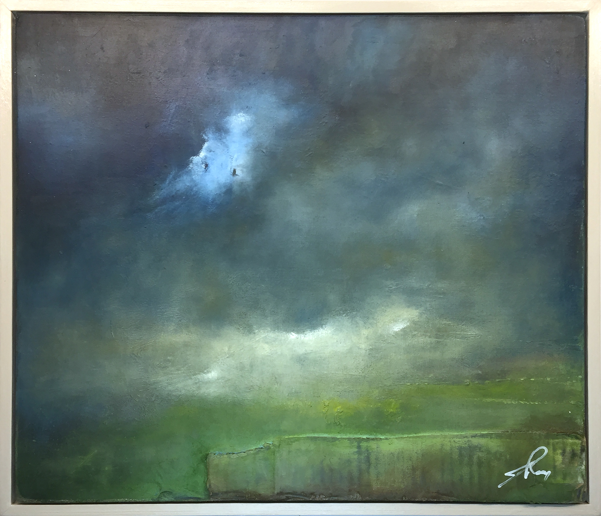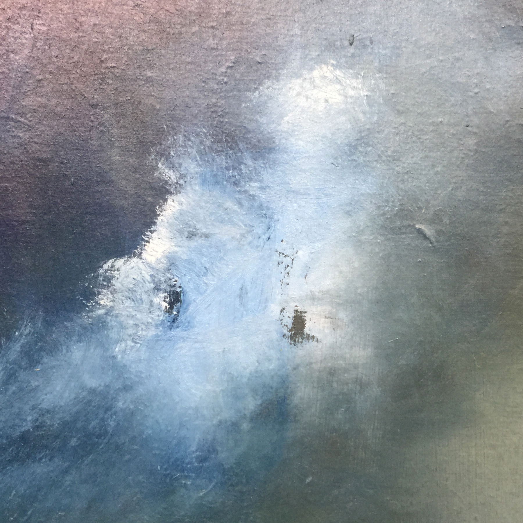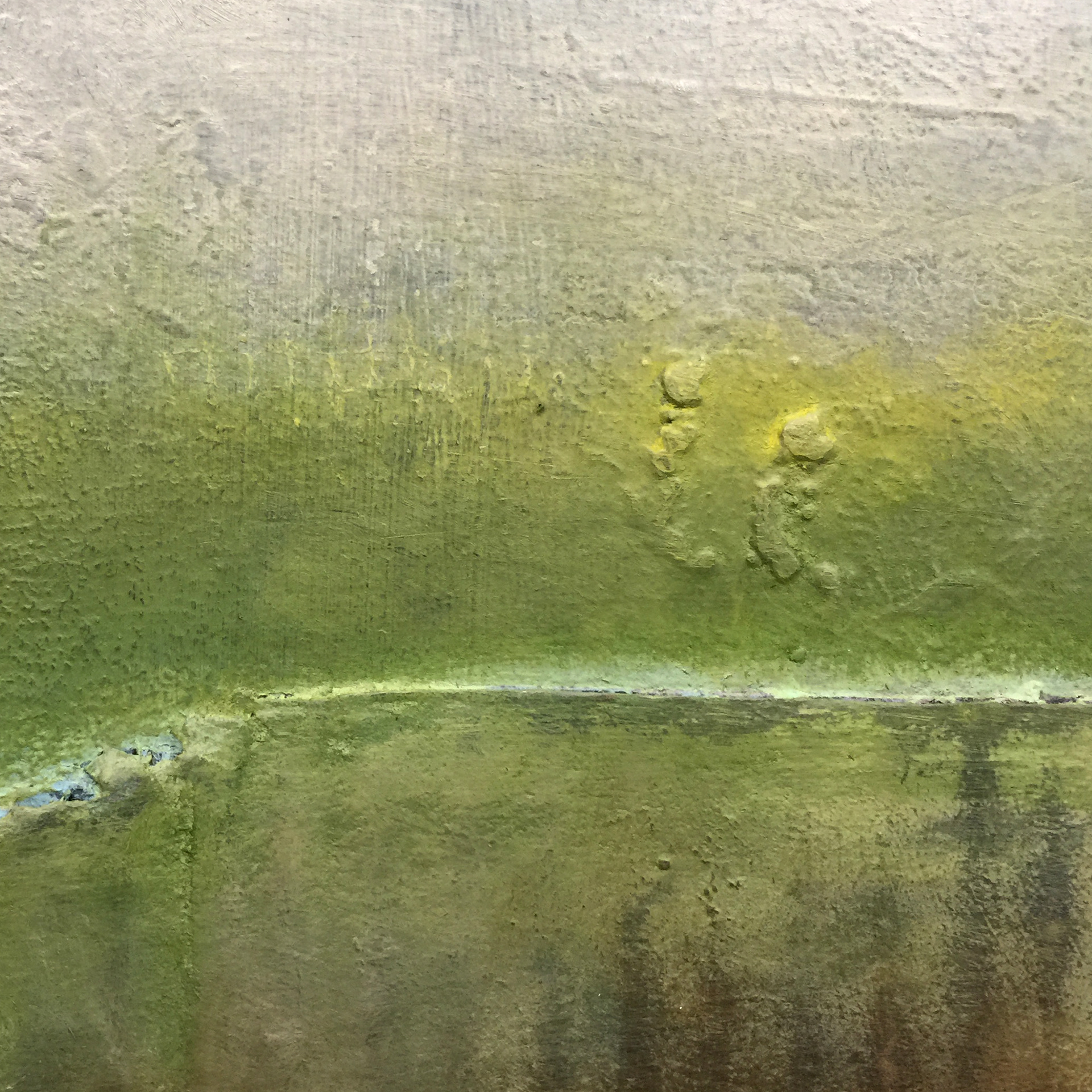 Abstract landscape painting, created with oils and employing strips of cardboard. Textured and moody, a visual representation of the D Minor chord.