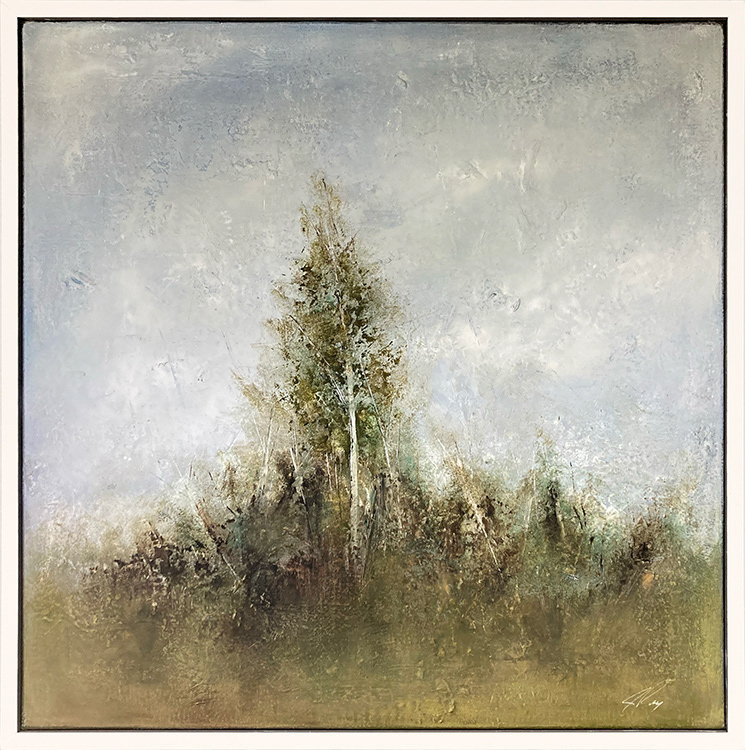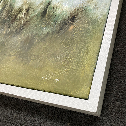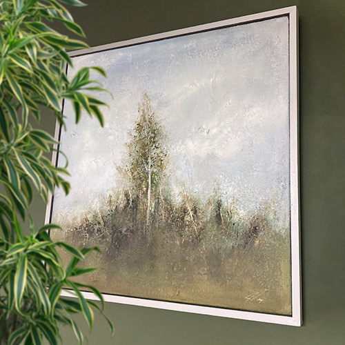 Textured abstract painting, employing a subdued colour palette of greens and browns resulting in a relaxing, calm piece. Framed and ready to hang. Artwork will be packed securely and protected with bubble wrap and heavy cardboard for postage.