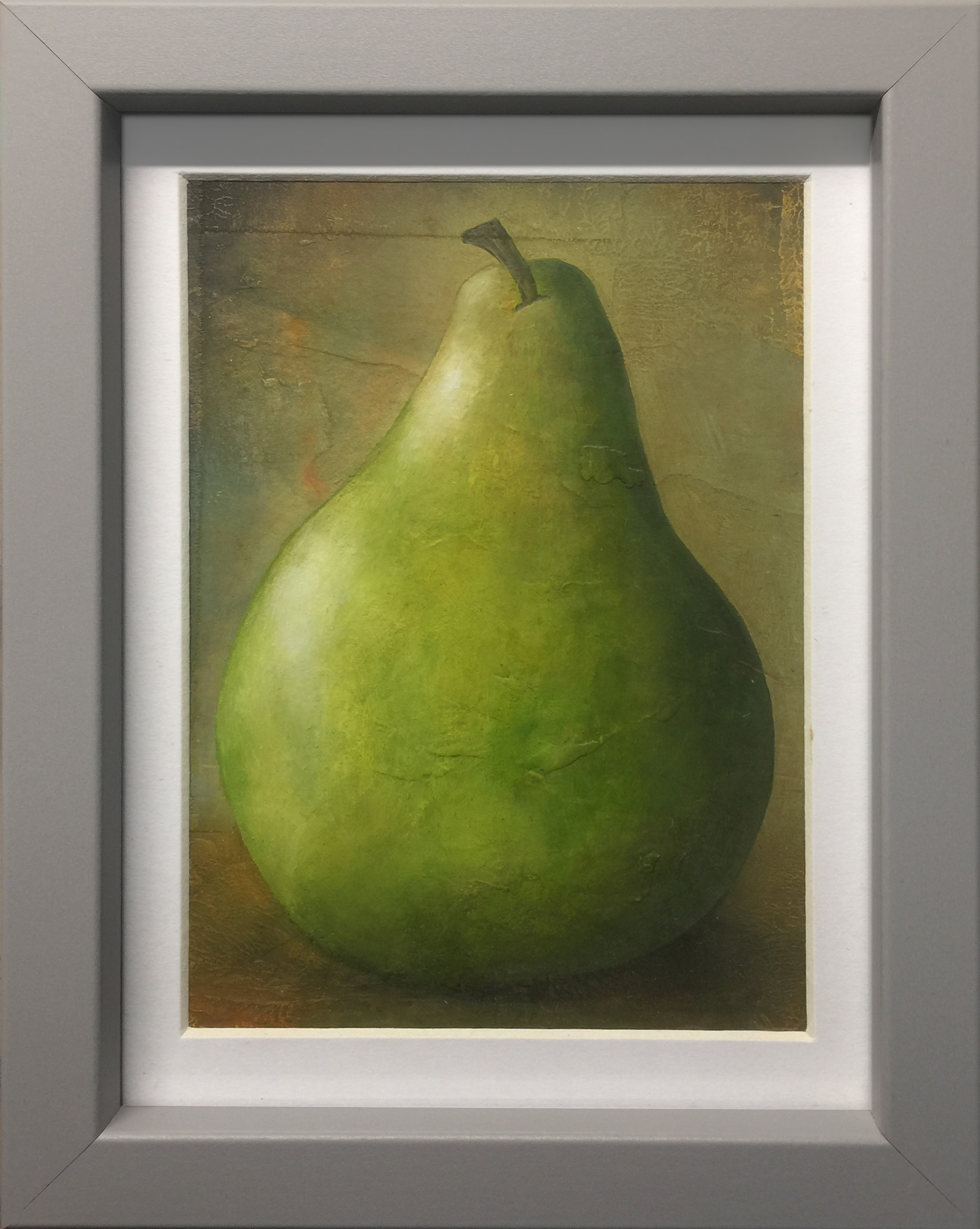 A simple, small study of a pear on a roughly textured background.