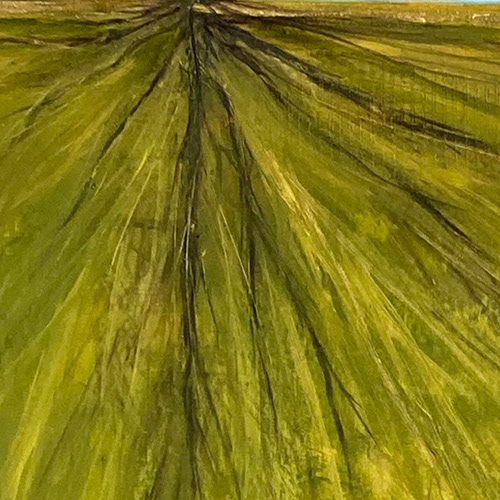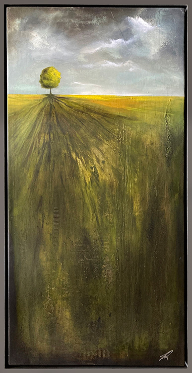 An abstract painting depicting an isolated tree on a remote, minimalist landscape. A few acrylic undercoat layers were followed by the application of oil paint, cold wax and sand with palette knife and brushes. Some areas were then scrubbed back and scratched out resulting in interesting textures reminiscent of the expanding root structure of a mature tree. Unframed, edges are painted black.
