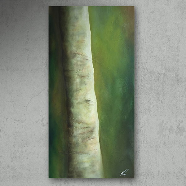 Textured, structurally simple painting of a tree trunk on a peaceful, green background. Unframed, canvas edges painted black. Ready to hang. Artwork will be packed securely and protected with bubble wrap and heavy cardboard for postage.